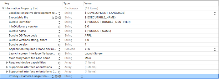 In the row you just created, add Privacy — Camera Usage Description to the Key column and make sure the Type column is set to string. You can leave the Value column blank or add a message to explain how you will use the camera to the user.