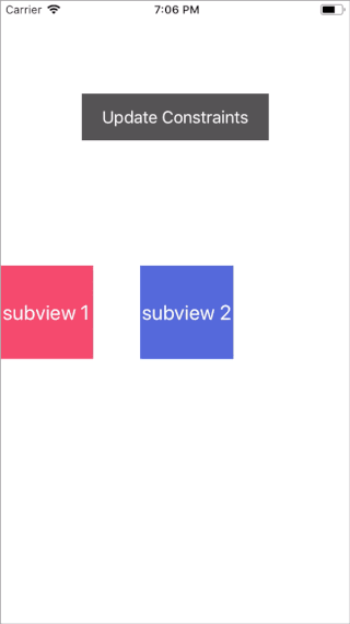 You probably noticed that subview2 moved when I updated subview1 even though I didn’t update its constraints.subview2 is constrained to the right edge of subview1. When subview1 gets moved, subview2 will continue to honor the left constraint it has with subview1.